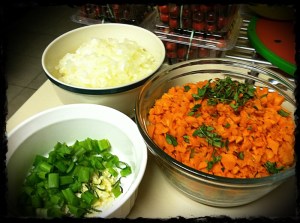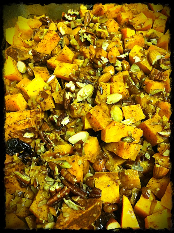 I started off with getting a sweet potato casserole in the oven. The creation didn’t mess with too many ingredients. Obviously… sweet potatoes! Added ingredients were coconut milk, coconut oil, honey, cinnamon, dried cherries and chopped nuts. I did not taste test but Ernie said it tasted great!