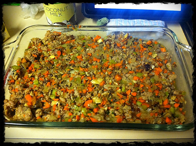 While the cauliflower was cooking I was slicing and dicing ingredients up for some Paleo Stuffing which consisted of italian pork sausage, carrots, mushrooms, celery, onions, garlic, dried cherries and almonds. I’m not a big fan of italian sausage and my taste tester had to sleep so I will know in the afternoon if this was a hit or not… ah well. I’ll keep you posted. I almost did forget to tell you of obstacle #2. I forgot to take sausage out to defrost… DOH! Poor Ernie who injured himself doing deadlifts today had to go ALL the way back out to Whole Foods to get more sausage! Bless him! And bless the meat guy who had sympathy for my wiped out person and hooked him up with a deal!