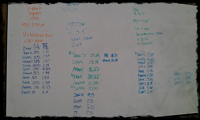 Whew! Today has been a super long day. You will see I finally took a pic of the whiteboard so you can see my WODs. Todays workout looked a little something like this (my time was 10:06):