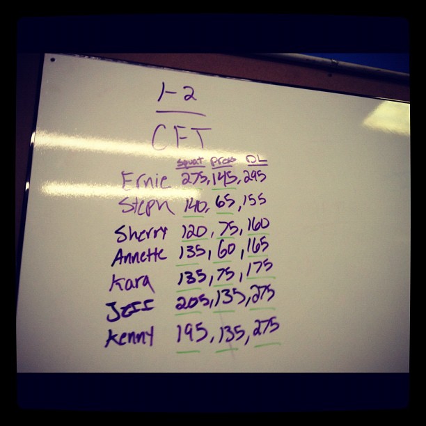 We did CFT for our WOD and it was good and not so good! I PR’d (Personal Record) my Press by 5lbs and my Backsquat by 5lbs. I did not however do good at Deadlift! I was not happy. I didn’t even come close to my Max of 185. Fatigue and bum hip got to me I think. So overall for the morning 140lbs backsquat, 65lbs shoulder press and 155 deadlift.