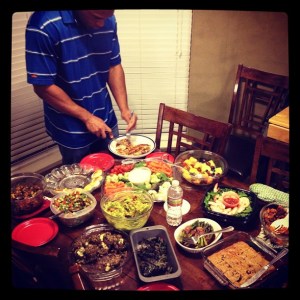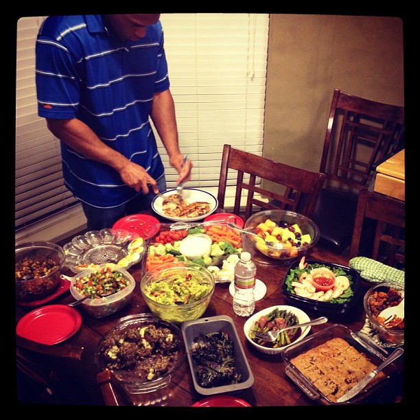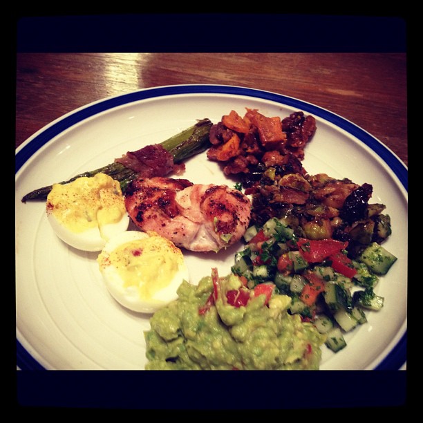 As you can see by the spread of food I was a busy girl that day. New Year’s Eve PALEO feast! Everyone brought their own protein and I provided most of the sides. Everything but the Israeli salad (which was great and resfreshing) brought by Josh. On the menu was Kale Chips, Guacamole, Holiday Brussel Sprouts (taken from Everyday Paleo), Sweet Potato Casserole, Prosciutto Wrapped Asparagus, Stuffed Mushrooms, Paleo Deviled Eggs, Walnut Date Bars and store bought veggie tray, fruit bowl and shrimp trays.