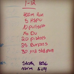 This morning’s WOD was a nice little chipper. I felt pretty good the whole way through until I got to the burpees. They got to me for some reason today! I got super hot super quick and couldn’t shed the layers fast enough. Once I regrouped I knocked them right out. And reluctantly went to the sled pull… 30yds, not that far but I’m just not good at this yet. It’s awkward and it’s cold outside… I’m whiny too! Get over it people! Hahaha, yes I do realize I get a little cry babyish…sometimes ALOT cry babyish but I wouldn’t be me any other way. I finished in 8:36… Things to work on: PISTOLS (I suck at those) and PULLING SLEDs!