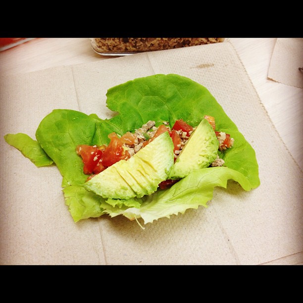 Moving on… I did have a little extra chicken on Tuesday so I cooked it up, minced it up, added chopped mushrooms, finely chopped walnuts, jalepenos (roasted and fresh), onion to make a little filling for some lettuce wraps. I like to buy the butter lettuce where it’s still attached to the root. They are giant pieces, sometimes a little flimsy but mostly durable enough. I sent some with Ernie to lunch and he kindly snapped a shot for me. I brought the same thing but I left my tomato and avocado at home so it wasn’t as pretty. Just another quick idea if you’re in a rush. It doesn’t take long to cook a small amount of chicken and sautee up whatever else and slap it in a piece of lettuce to have a quick snack or meal. NOTE: it’s best to mince, shred chicken while fresh cooked and warm. You may know that but I thought I’d share anyways.