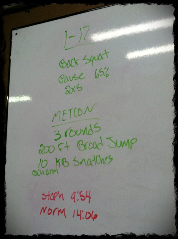 The MetCon looked fairly do-able, if that’s the right word. Maybe more along the lines of less intimidating than other days. Those are the moments when I should say there’s NO SUCH THING! But I don’t, I just think this won’t kill me. Sure enough it was freakin HARD. Broad Jumps?!?!? ARE YOU F’ING KIDDING ME? for 200 ft! Major SUCK in the world of workouts. I promise. I was gassed, dying, melting, etc. I only had 3 rounds, I was spent. WTH is wrong with me is all I kept thinking. Why can’t I kill this WOD? I tried with all my might and I finished and that’s all there is to it, RIGHT? YUP, I FINISHED. All is well and life goes on π 9:54 was my time and only because Grant pushed me on my last 10 KB Snatches. Glad he was there cause I would have dropped the ball. I did my last 10 unbroken and finished under 10 minutes.