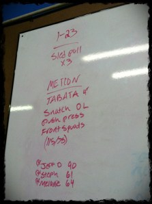 Out MetCon just about killed me. Was it a case of the Mondays? Or was it just flat out loserness? Not sure at this point but it was close to killing me. Snatch DL is very weird feeling. Having to deadlift with a super wide grip definitely ups the ante in knocking reps out. The weight was light “for a deadlift” at 75lbs. And TABATA to boot. Although we only did half TABATA 4 rounds vs. 8 rounds, but that was fine with me because I was going to have to push press that 75 lbs. My max regular press is 65lbs but with the “PUSH” it’s easier to get a little more weight up. I didn’t do my first round of push press because I was so spent after the deadlifts. I think I managed to get 13 presses. SUCK! We moved onto Front Squats and again it took some energy to freakin just clean it. So I wasted almost the whole first round just trying to talk myself into getting the bar up. I finally did and I was beat. I really double sucked at front squats as well. Overall REPS at 61. I KNOW I could have done more, but I talked myself out of it before the MetCon even started. Not a wise thing to do and I don’t suggest punking out like I did. I am happy I did it”RX’d”. I’ve done a few but not a lot so it feel goods when I can MOVE the weight around. I was spent but it was a good spent.