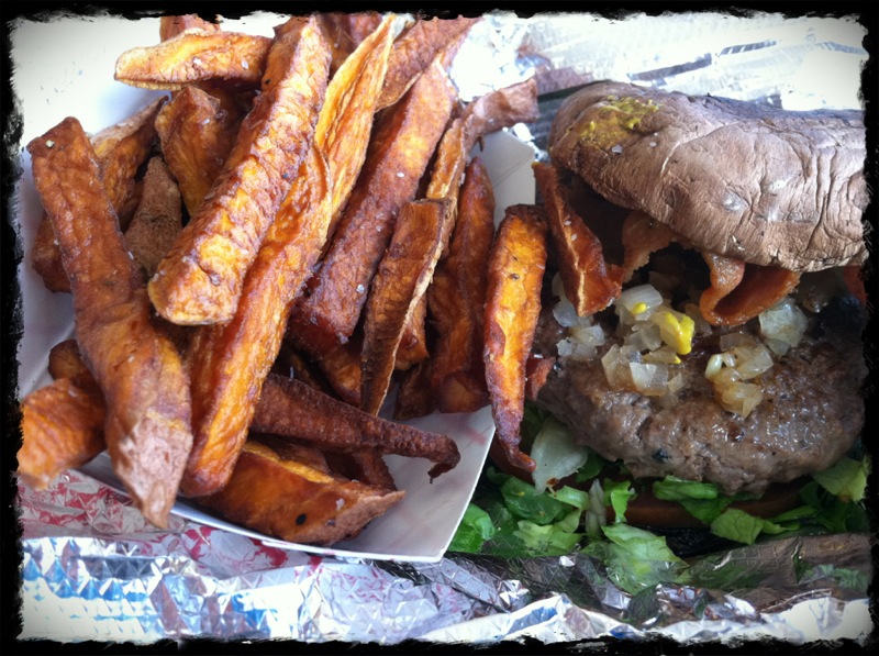 A convenience store with a burger place or was it a burger place with a convenience store? Who knows. I needed to see the Paleo Burger on the Menu… because this wasn’t special order where they look at us weird for asking for no buns or mayo or whatever restaurants think when we order NO GRAINS. And there is it was the Fit Cross (Crossfit Paleo Burger). It’s not the holy grail of burgers I know this, but it’ going in the right direction. Local Grass Fed beef cooked up just right, slapped between portabella mushrooms, lettuce, tomato, onions, natural ketchup and mustard. It was yummy. Especially when you’re out of towners, this was a good find. We ordered one burger each to “check” it out. WIN! So we ordered two more and added sweet potato fries after we inquired if they had them. Perfect! It filled us up and we knew it was good local homegrown grass fed beef. We talked to the owner and peeps that worked there and found out that not all grass fed beef is created equal. Ranchers are allowed to grain feed the last 120 days before slaughter and are still able to claim their beef to be “grass-fed”! I had no idea! That’s how little research I’ve done. I’m saddened by the news but also now informed. So it’s an overall win.