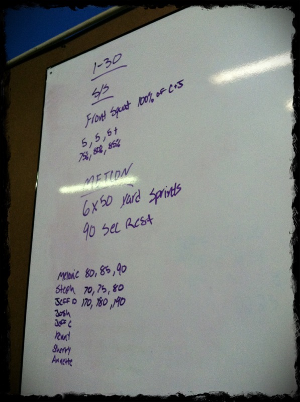 The MetCon was 6 50 yd sprints with 90 seconds of rest in between. Not so bad. I’m not a sprinter but I put forth my best efforts.