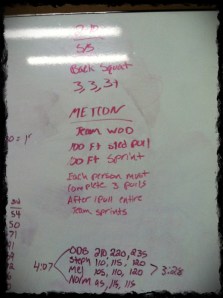 We started off with backsquats. I knocked them out alright but nothing super exciting or beastly. Moving on to the MetCon. Sled pulls and sprints! I’ve expressed how sled pulls and I don’t get along so well. But I figure the shorter distance would be ok. And for the most part it was better than I imagined in my head. But they do take a toll on you. Mel and I finished 3 rounds of sled pulls and sprints in 3:38. I’m thinking we did alright πŸ™‚ But wait there’s more…BONUS ROUND relay.