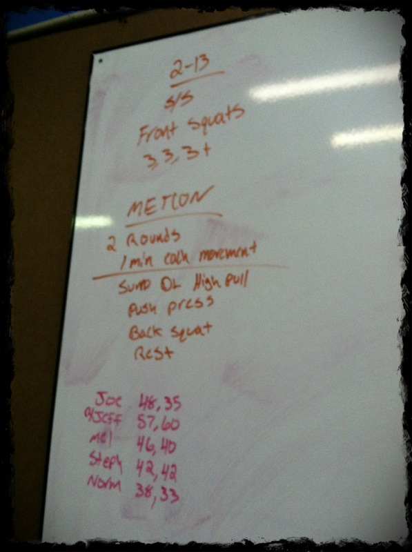 The MetCon was a nice little sample of Sumo Dead Lift High Pulls, Push Press (ARGH) and Back Squats – 2 rounds of 1 minute of each and 1 minute of rest after all three movements max reps. 65lbs for me. I went a little too quick like on the SDLHPs and wore out pretty quickly. Then I had to quickly transition to Push Press. It wasn’t pretty but I hung on. Back Squats were a little less taxing and a much needed break for the arms/shoulders. ROUND 2: I timed out my SDLHPs a little better and got a few more reps than the first round. But I was wasted for the Push Press. I knew I had to kill the Back Squats to give me any decent rep count. And I did alright as I matched my 1st round number of 42 reps. I wasn’t at the top of the whiteboard but knowing I couldn’t get those push presses cranked out I’m ok with it. I put in work and that’s what counts!