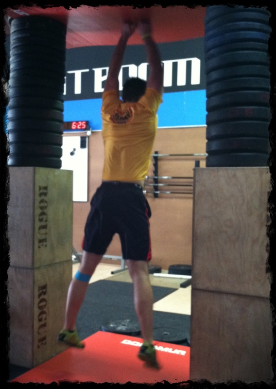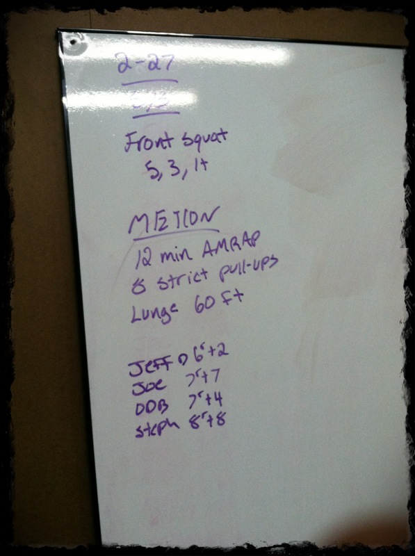 Front squats for skill/strength. 5, 3, 1+. I did a warm up with just the bar then jumped up to 75 lbs and started my 5 reps. It seemed light today. Maybe because I had a fantastic massage yesterday or maybe just because I’m getting stronger. Maybe my crazy strange love for CrossFit intensified after the first Open WOD, who knows. But it felt light. I Hope my coach isn’t reading! LOL, he’ll make me pay tomorrow! Then moved onto 80lbs for 3 reps and onto 85lbs for 19 REPS – YAH BUDDY! It’s taken a while for me to get “strong” but I’m getting there. And today I feel I really pushed those last 4-5 reps out. It took a lot out of me. Probably time to test a new PR… maybe? maybe not, hehe.