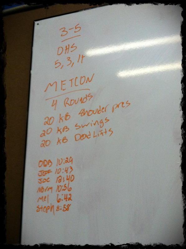 The MetCon was 4 rounds of 20 KB presses, 20 KB Swings and 20 KB Deadlifts. Us girls used dumbbells instead of the kettle bells and the question of the morning was 20lbs or 25lbs! Well I can lift 25lbs no biggie but for 4 rounds of all those movements, eh. HAHAHA… Well I’m glad I picked the slightly heavier weight. I pushed myself where as I may have gotten off too easy with the 20lb weight. I finished with an 8:58 time. Not bad, Not bad.