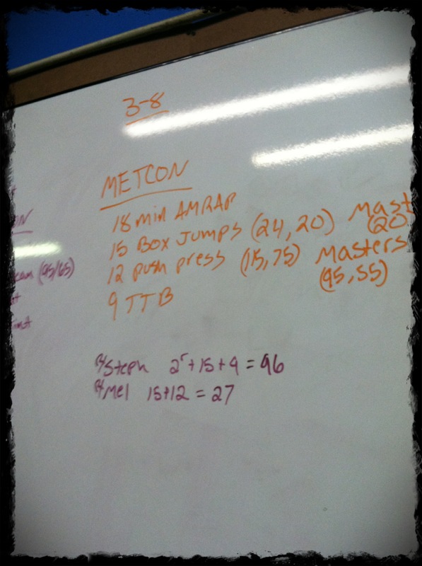 As always I’m wishing that in my youth I chose gymnastics as my sport of choice. TTB are a ginormous bag of SUCK! And today 75lb push press was heavy… not oh this is a lil heavy today… just heavy. Box Jumps are box jumps but on these you had to show full hip extension at the top. And I can’t forget to mention I NO REPPED my first BOX JUMP! Ha, I’m AWESOME!