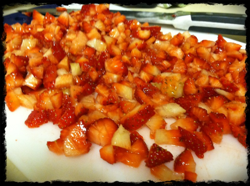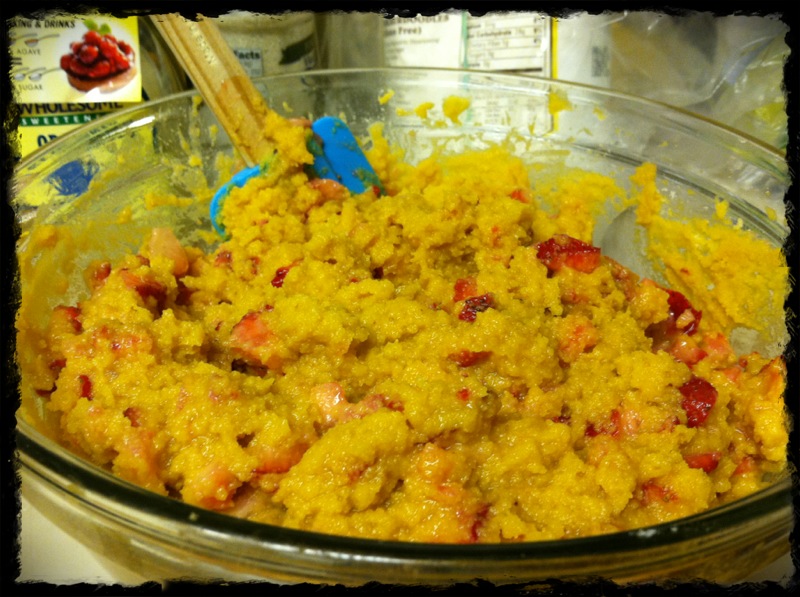 I tripled the recipe for 2 dozen, YUMMO! Coconut Flour, Eggs, Agave, Celtic Sea Salt, Arrowroot Starch, Vanilla, Baking Soda and STRAWBERRIES!
