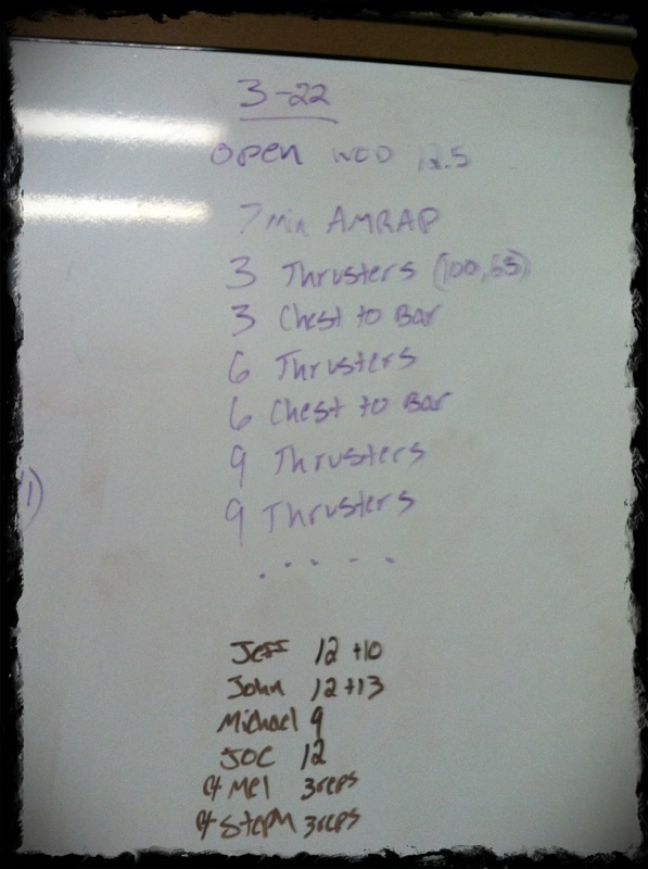 12.5 came as a repeat form 2011. I really don’t care but it seemed to cause a stir amongst the mob. Why complain? Just beat what you did last year! Easy right? Heheh, I don’t know. I just know I can’t do a pull up so HOW IN THE WORLD am I going to get my chest to the bar? I’m not.
