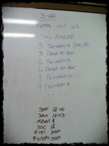 The WOD is a 7 minute AMRAP/Ladder of Thrusters and Chest to Bar. So first round is 3 thrusters, 3 chest to bars. 2nd round is 6 thrusters, 6 chest to bars…keep adding by 3s and do as many rounds as possible. Like good little soldier I knocked out my 3 reps of 65lb thrusters to get counted for the official score and went to band assisted chest to bar. I made it through to the 12 thrusters and only completed 5 of the chest to bar in that round. Final total of 53! Heheheh. Ah well. 7 minutes and WAM BAM thank you MA’AM! I was beat. Thrusters take a toll on you fast 🙂 It was fun. And I’ll be there on Saturday to cheer on the remaining BOOM Beasts. Good riddance 2012 Open!!