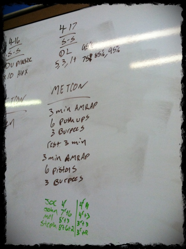 Now the MetCon involved pistols and although they are not near as dreadful as wall balls, I still suck at them. I do feel like I did a little better on my right leg. My left IT band still gives me grief so I wasn’t as strong on that side. So we had a 2 part MetCon. First part was a 3 min AMRAP of 6 pushups and 3 burpees. Two movements I don’t mind doing but golly gee whiz, I’m so sick of burpees! Three minutes isn’t very long so you really gotta push yourself. I managed to almost get 6 full rounds in but I failed short by 1 burpee! I think I was just too sleepy to really kill those 3 minutes. We got a 3 minute rest and then it was 3 minutes of 6 pistols (3 per leg) and 3 burpees. I was much slower at this because I am no good at the pistols. I managed to get 3 rounds + 2 pistols 😦 wah wah!