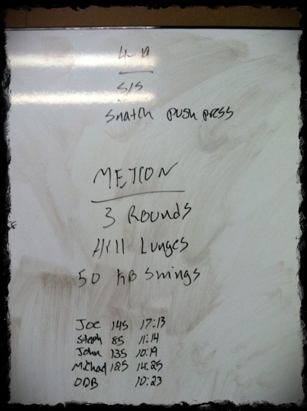 So for our MetCon it was 3 Rounds of Hill lunges and 50 KB Swings. Dang that’s gonna be a lot of lunges and KB swings! My legs are still sore from Tuesday…errr and uh Monday! Coach tells us what KB to pick up… 1 POOD for me and now we gotta walk it to our “enemy” the HILL! I hate this hill! I really do because when we are running it’s the HILL that gets me, EVERYTIME! We walk the 200 yds or whatever it is to get to our starting point. Coach marks out a distance of what looks like TOO long for lunges but it is what it is. He comes back and tells us we will lunge from one cone to the other. Run, walk or crawl back and then knock out your 50 KB Swings. FOR TIME! 3, 2, 1 GO. So the first round of lunges weren’t so bad. We all kind of hit them at a good pace and felt good. Not feeling so good after the KB Swings. But I did do the first round UNBROKEN! HELL YA! Second round of lunges – PAINFUL! But survived. Second Round of KB Swings were not unbroken. I did 20, 5, 15 and 10 I think! I was behind John and ODB by like a few swings and was quickly catching up on the lunges but when I got back for the last round of KB Swings I lost form and the back started aching and it was sad. I managed to knock out 15, 5, 5, 5, 5, 15. Finished for a Time of 11:14. The most NOT FUN part was having to carry our darn kettle bell back to the box 😦