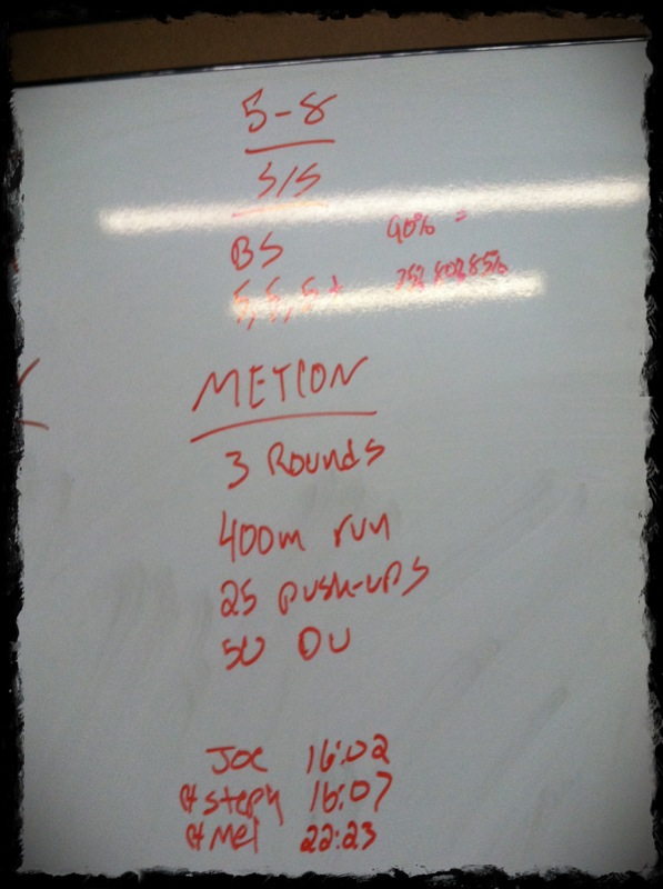 The MetCon was 3 rounds of 400m run, 25 Hand Release Push UPs and 50 Double Unders. My first 400 was smooth and felt good and my first 25 push ups SUCKED! I was dragging, my chest, arms, everything was burning. I struggled big time. Once I got those knocked out it was onto DU’s which I figured I had and I was WRONG! I couldn’t find a rhythm! I was pissed! I finally got 50 completed and took off for the next run. That 400 was the worst 400 in the history of time. But in that 400 I got my whiny attitude out of the way and got a little better for the last two rounds. My Double Unders came back to me and I felt mentally I redeemed myself. I still sucked at the push ups, just not as bad as the firsts round! Time: 16:07