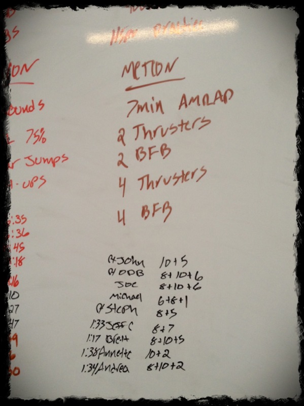 Holy Guacamole! (yummm guacamole!) Todays MetCon about killed me today. I think maybe on another day when I could BREATHE then possibly I could have done better?!? I seriously couldn’t catch my breath all morning long. It sucked and pissed me off and I was on the verge of needing the puke bucket. As always I pushed through but my PUSH wasn’t that great today. This was an AMRAP ladder for 7 minutes. 2 Thrusters (65lbs), 2 Bar Facing Burpees, 4 Thursters, 4 BFB, 6 Thrusters, 6 BFB, etc. I got through 8 of each and then 5 Thrusters. This was no bueno. I was hoping for more but it was NOT happening today!
