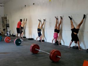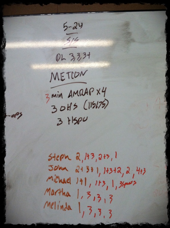 We had 4 rounds of a 3 minute AMRAP that included 3 OHS and 3 HSPU. I could have sworn it was originally 2 minutes but I’m also half asleep at 5am. As you can see on the white board image, I didn’t get very many rounds in. Going from OHS that kills my wrists, even with my handy dandy Strength Wraps, to HSPUs is killer. My shoulders are dead, my wrists are dead, I’m just dead. By the fourth round, it wasn’t the OHS that was killing me, it was the HSPUs! Holy Crapola it was hard to knock out 3 of those bad boys.