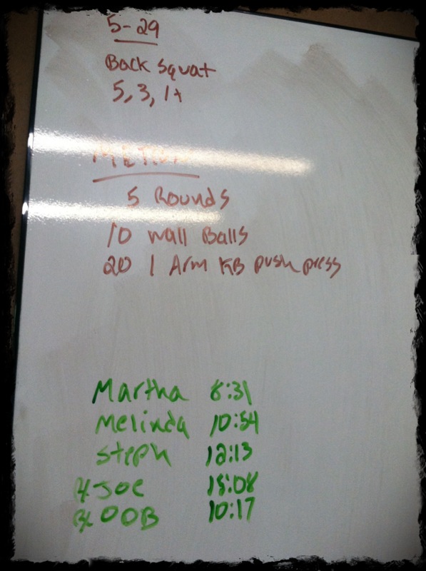 After getting my butt kicked on Monday it was time to get back to the routine. Showed up at the BOOM BOX for some Back Squats, Wall Balls, and 1 Arm KB Push Press.
