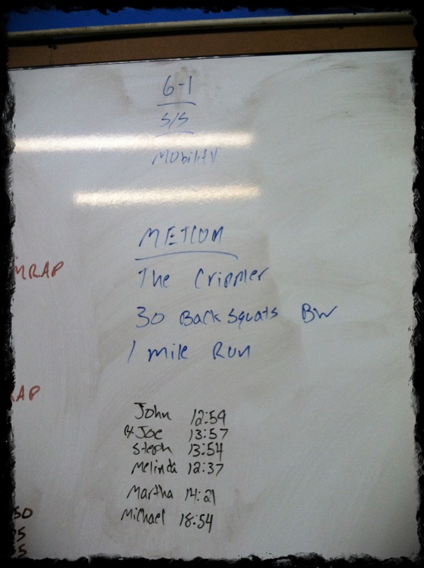 Yuuuupppp! Insane right? Well my body weight is damn near my MAX Back Squat so we took a percentage of our body weight. My weight today for Back Squats was 100lbs even. Not super heavy but 30 reps is A LOT! I should have kept better time at when I finished the squats so I could gauge my run. It’s not easy taking off to run after so many squats in a row. I broke the 30 up – 1 set of 10 and 4 sets of 5. I thinkI finished somewhere between 3 and 4 minutes but I am not certain. Overall time: 13:54. One more time for those of you who don’t follow along regularly. I suck at running, I don’t like running and yes I suck at running. Unlike on Monday where I walked some of the mile due to my poor eating and the blazing sun, I’m happy to report I did not stop this time. In the past I typically don’t stop anyways but my self sabotaging eating habits really screwed me over this week. My wannabe skinny girl in my head kept saying, Coach just made you weigh in to determine backsquat and it is not a number you are happy with so DON’T STOP! And I didn’t. I forget how long it takes to rid your “clean” body of “junky foods” but I’m thinking it’s still a while. Just gotta keep keepin on!