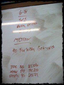 Metcon: TURKISH GET UPS (aka TURKISH TORTURE) – 40 reps for time. Below is a picture to demonstrate. Up and down is one rep. Goal was to do 20 reps on each arm. I practiced with a 10lb dumbbell and moved up to 12KG (approx 24lbs) Kettle Bell for the workout. I did 5 on each side up to 25, then went back and forth in 2’s. This didn’t end up evenly and I was smoked. This was a no joke kind of MetCon. Long and grueling. Time 20:21