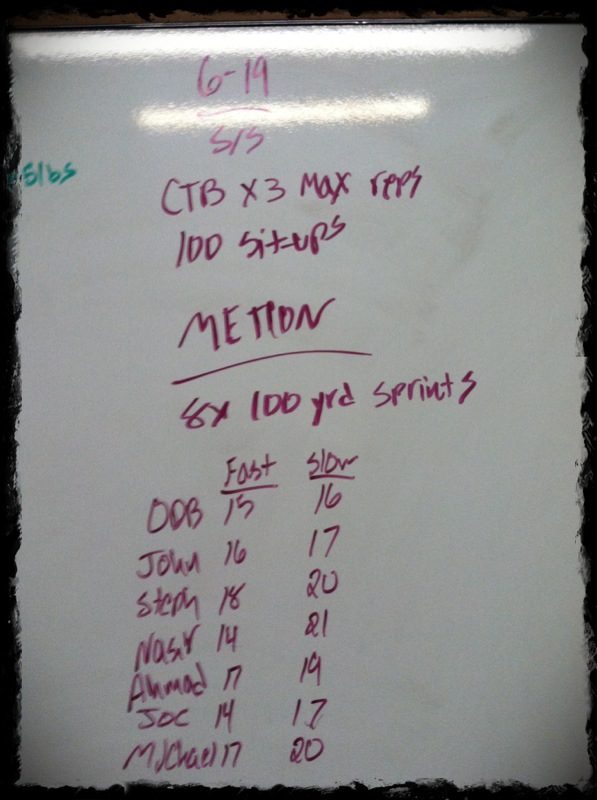 100yd sprints. I’m better at sprinting than straight up running but I’m still not very good. We went out into the parking lot and Coach had 50 yds marked out, so our sprint was 50 yds to a cone then 50 yds back. I tend to slow down too much before I have to turn so I’m sure I wasted a valuable second or two. My first 2 or 3 sprints were 19 seconds, then I dropped to 20 seconds. Somewhere inside of me I found a little extra umph and dropped to an 18 second sprint. My last one was back at 20 seconds. Coach took our lowest and highest sprints for the whiteboard. I was the slowest in the group which is never fun. Some of these guys were getting 14 second times. Poor Poor Petri. Ah well.