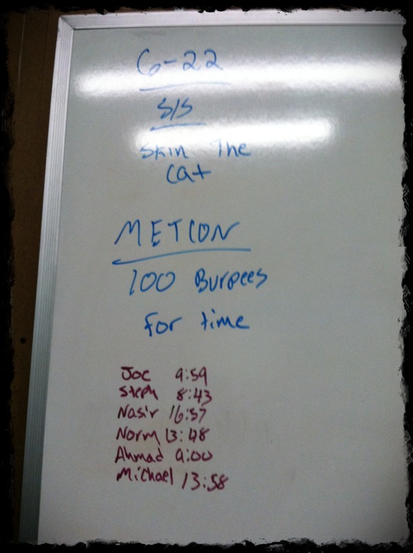 I love Fridays. Unless you work weekends I can’t imagine why you wouldn’t like/love Fridays. This Friday however I was greeted at the BOOM BOX with SKIN THE CAT….?!?!? really, what the hell is that and with 100 BURPEES for time. I was already trying to sleep in this morning by sleeping through SNOOZE and now I have this insanity to do.