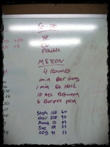 I’ve learned over the months to not underestimate the WOD on the board. I used to do that a lot and really get the crap beaten out of me. Today that silly little thought really started creeping in. I was sure this would be hard but really it didn’t sound THAT bad. Uh ya, how about after 30 seconds of hanging on the bar was I ready to die. I would not be good in a torture type situation. I would sing like a bird. This my friends was torture. (And please I’m not diminishing the fact that people really do get tortured and it’s a terrible thing. This is for entertainment purposes only. And it’s sad that I have to say that cause there are some people out there that are too serious.) Moving on to the Deadlifts. Well the weight was easy to get up but easy to HOLD, hell no! It sucked! I dropped it twice on the first minute out of pure shock on much it sucked. I dropped the bar once each round for the rest. I dropped A LOT while hanging on the bar. I am unable to suck it up and look past the PAIN at least when it comes to my hands. So at the end of our 4 rounds I had a total of 12 drops which meant 60 Burpees lay before me. I didn’t rush through them but I didn’t drag ass either. I look forward NEVER to any similar workouts. The end!
