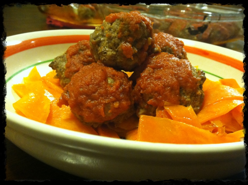 I have SWEET POTATO noodles to talk about!! We are always stocked up on ground beef and I was going to do my standard meatballs with zucchini pasta but I thought I’d mix it up a bit. I had recently read about SWEET POTATO noodles but I didn’t really follow up on it. It was just a FB status. After some googling I found it posted over at Civilized Caveman Cooking. It was easy enough and was pretty darn tasty!