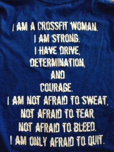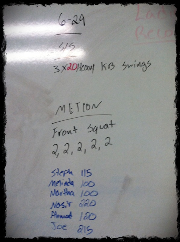 MetCon: Front Squat 2,2,2,2,2 Like I said the endurance was out of the equation today. Thank the Baby Jesus! I was perfectly fine with Front Squats. I wasn’t however prepared for FAILURE! After warming up some I started at 100lbs which was 75% of my max of 135. So my weight strategy was 100, 110, 115, 125, 135. I’m not gonna lie… 100lbs was HEAVY! It’s been a while since we’ve done Front Squats but I didn’t think 100lbs would be heavylike! 2 Reps down and not really a problem. 110lbs, eh not so bad. 115lbs I did it but I could feel the struggle. 125lbs I got down and couldn’t push back up, dropped weight 😦 So I walked around, sat down, watched everyone else. I came back for my 5th round and decided to drop to 120lbs. First rep finished, 2nd rep I got down and halfway up and felt STUCK, completely STUCK no more UP in my legs. And I dropped the weight! So it was a BIG OL FAIL and it SUCKED!!! It’s one day, one moment, blah blah blah. I hear what you are saying but I still hate the fact that my 1RM is 135lbs and I couldn’t get more than 115 for 2 reps. Yes I was a certifiable Debbie Downer. I can’t help it. I know at the end of the day it’s fine. Next week I could PR for all I know. But in the moment it’s defeating. We aren’t always ON but that’s not what you’re thinking as you’re struggling to move the weight. Thank goodness it’s Friday!