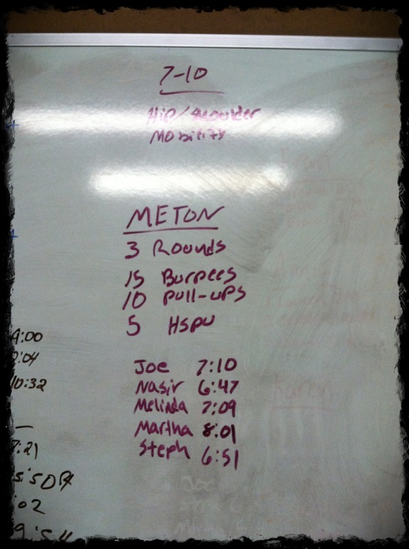 MetCon: 3 Rounds of 15 Burpees, 10 Pull Ups and 5 HandStand Push UPs. Not too many movements and lower reps this should be a quicky WOD and it wasn’t too long, I still struggle too much with the pullups but I didn’t wuss out as much as I normally do. And since I don’t have a RX HSPU we did a modified version. We put our heels up against the wall, bent over and had our hads at just the most uncomfortable position to do a push up. Those sucked but not as bad as pull ups. Time: 6:51
