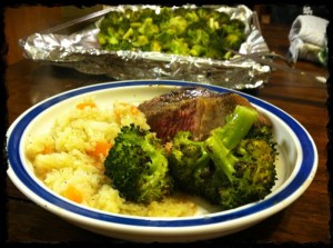 I waited till the last possible second to cook dinner. Ernie works out late so I try to time dinner for when he gets home. But in my procrastination I had to come up with a plan ASAP because of course I had no plan! So with ninja like quickness I got broccoli cut up, tossed it with olive oil, himalayan salt, pepper and red pepper. Baked that at 450° for 15 minutes. Got two grass-fed steaks seasoned and going on the stove and prepared a last minute effort at some Cauliflower rice. Nothing like my faux Spanish rice or Asian fried rice. I got some chicken broth heating up in a pan, got the cauliflower shredded up in my handy dandy food processor. I dumped what ended up being a lot of “rice” into simmering chicken broth and realized I needed more broth. I don’t have measurement but it was probably a cup of broth that I used. I got that simmering and put a lid on it. While that was going, I chopped up some baby carrot and onions to dump into “rice”. I added some salt, pepper and Kerrygold butter and put the lid back and and let it simmer away. Probably for 15 minutes. Just keep checking for the broth to be absorbed into the cauliflower “rice”. I don’t know if I was just really really hungry or if it was that damn good but I loved it! I took an pic but as you know it’s nothing professional.