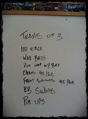 100 of each of the following movements divided amongst the team: wall balls, pull ups, cleans (65lbs), front squats (65lbs), kb swings, and a med ball run around the loop (which was FOREVER)!!! My team kicked ass! The new girls did awesome and pushed hard and I really think they loved it!! Time 33:30! It was a lot of work and so much fun. We’ll be dropping in all week and we got some kickass shirts too! I was amped all day and really felt good. I ran the best I think I have ever run (Thanks Coach, since I’m always hating on the running at home).