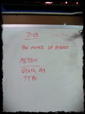 MetCon: Death by Toes to Bar! Yup that’s right folks! Suckity suck suck! I managed to get 5 rounds in. I almost completed 6 rounds but just didn’t get that 6th rep. Since coach still wanted us to get more work in we worked up to round 10 on the floor. We laid down put are hands to the wall and had to lift our legs to the wall. That I can do! It was killer on the abs but I didn’t have to hang from the bar!