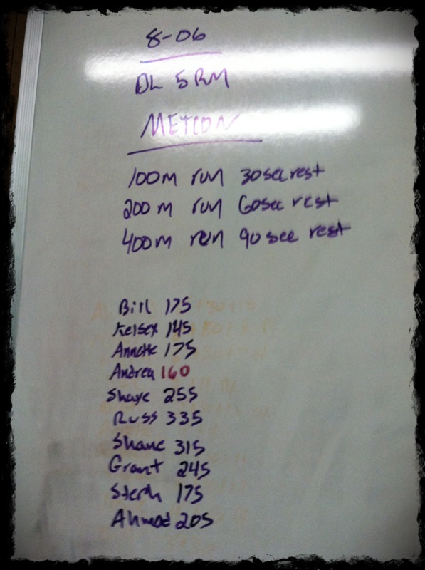 We ran out of time for Dead Lifts but we had the option to stick around for the 6 am class and work in with them. Of course I stuck around. I typically lounge around there for a while post WODs daily. The goal was 5 RM. I’ve scanned through my pics and posts but couldn’t find an attempt at 5RM for Dead Lift so I have nothing to compare to. My 1 RM is 185 so I think busting out 5 at 175lbs is good progress. My right butt cheek was done so I didn’t try to go for heavier weight.