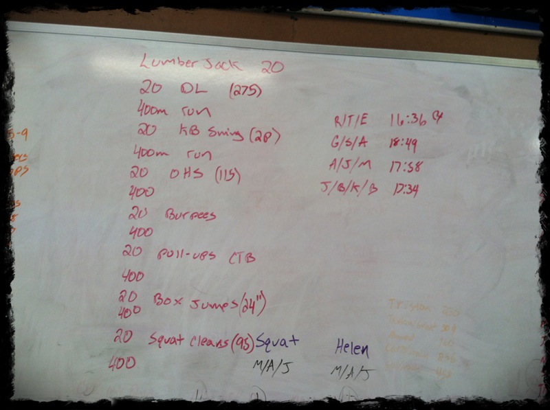 20 DL (135lbs), 400m run, 20 KB Swing (1 POOD), 400m run, 20 OHS (35lbs), 400m run, 20 Burpees, 400m run, 20 CTB Pull ups, 400m run, 20 Box Jumps (24″), 400m run, 20 Squat Cleans (75lbs), 400m run. We did this as a team at weights suitable for the 3 of us. Only one person could be working and only one person had to do the runs vs. the whole team running, which was a good thing I suppose. We were killing it at first because we had our youthful 15 yr old teammate (Grant) do all the running! It was at the Chest To Bar Pull ups where we slowed down and never recovered. If only Annette and I had anything to give in regards to those pull ups I’m sure we would have landed ourselves a 1st or 2nd place. Instead we fell short with a time of 18:49. I know my running pace didn’t help much either. Either way it was definitely a good and fun WOD!