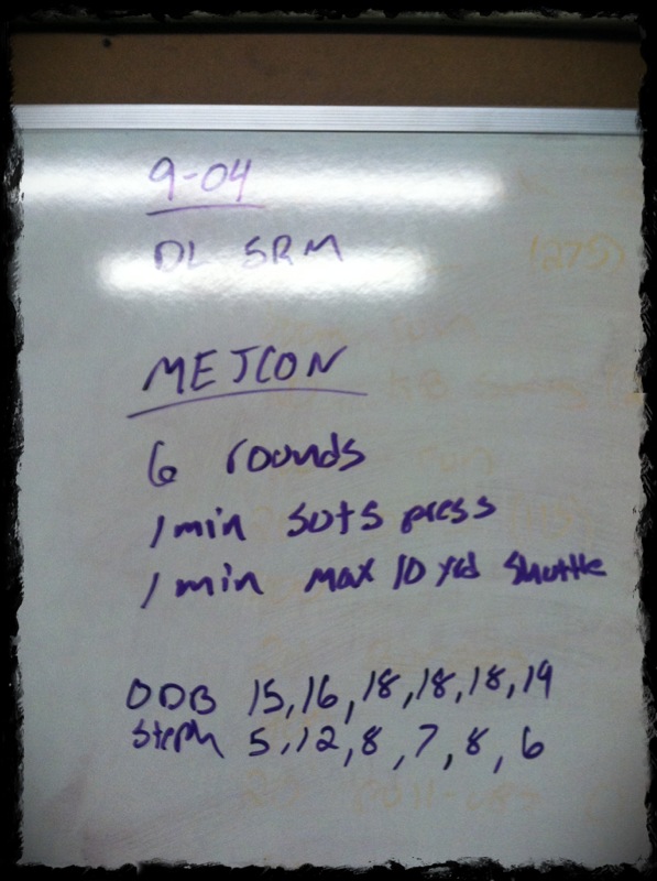 Even though I ate rather poorly and had a restful weekend we still had some BOOM BOX fun on Labor Day. Coach was sure to make us to do work and that he did fellow readers, that he did! We started off with a game, although it wasn’t a game o’ fun. We split up into groups of 3. He gave us 3 different sets of CrossFit Totals from Friday, he didn’t give us the total just the weight for each movement. After we wrote them down we had to run 400m, come back and do the Math for the first CrossFit total, RUN 400m, come back and do the math for the 2nd CFT, run 400m and come back and do the math for the 3rd CFT. If we did the math wrong then it was a burpee penalty. Thank goodness we did our math right. After we all composed ourselves, the top 2 teams moved on to the LIGHTNING round, lol. Us losers had to pick a team to side with. We were there to watch, not talk and hope they got their answers right. If they didn’t we got dealt a burpee penalty for every wrong answer the team got. There were 6 categories and it was an A or B type answer format. Out of 9 questions the team we were with only got 3 answers correct That left us with 30 burpees each for consequence!