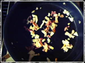 After bacon is slightly brown add onion and sautee till bacon starts getting crispy