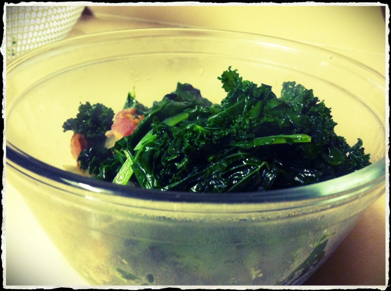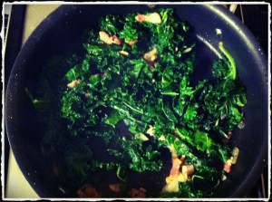 Toss in rinsed Kale right on top of bacon and onions. At this point is when I add my seasonings. Let simmer than stir away as it wilts down.