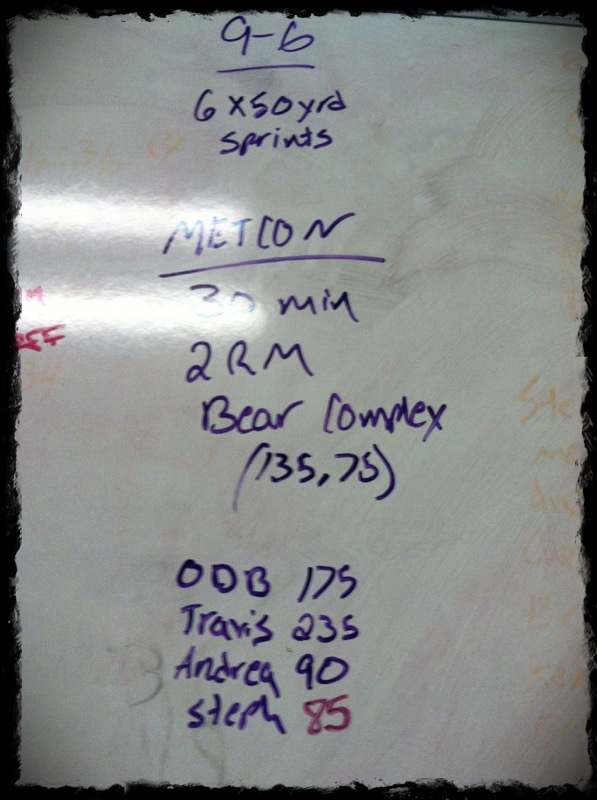 I even woke up with ease this morning and was ready for the BOOM Box! Skill/Strength: 5 rounds 50yd sprints. I can do short distance sprints much better than 100 or 200 yd ones. Plus on flat ground vs. that damn hill makes the running all the better. Today we mostly focused on form. It appears I was sprinting like a loonball and Coach had me work on technique. Let me tell you it’s hard to actually THINK about how you run. All of sudden I feel like I’m in quicksand. My BRAIN is draining what little speed I thought I had. But by the end my technique was better, now I just need the speed!