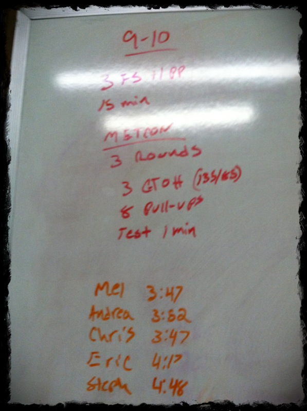 MetCon: 3 rounds of 3 GTOH @ 85lbs, 8 Pull Ups, 1min rest