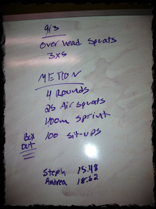 MetCon: 4 rounds of 25 air squats, 400m sprint, BUY OUT 100 butterfly sit ups