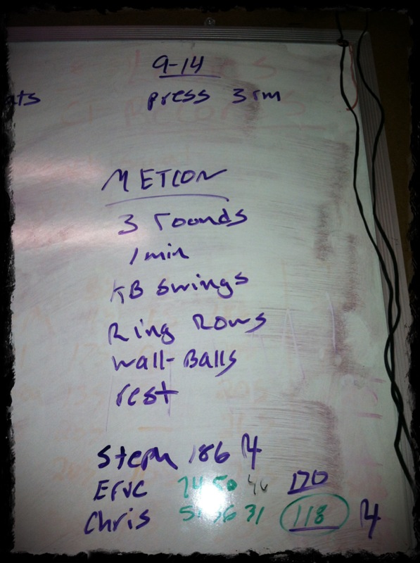 MetCon: 3 Rounds of 1 minute KettleBell Swings (1Pood), 1 minute Ring Rows, 1 minute Wall Balls (14lb ball), 1 minute REST