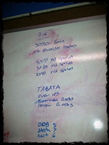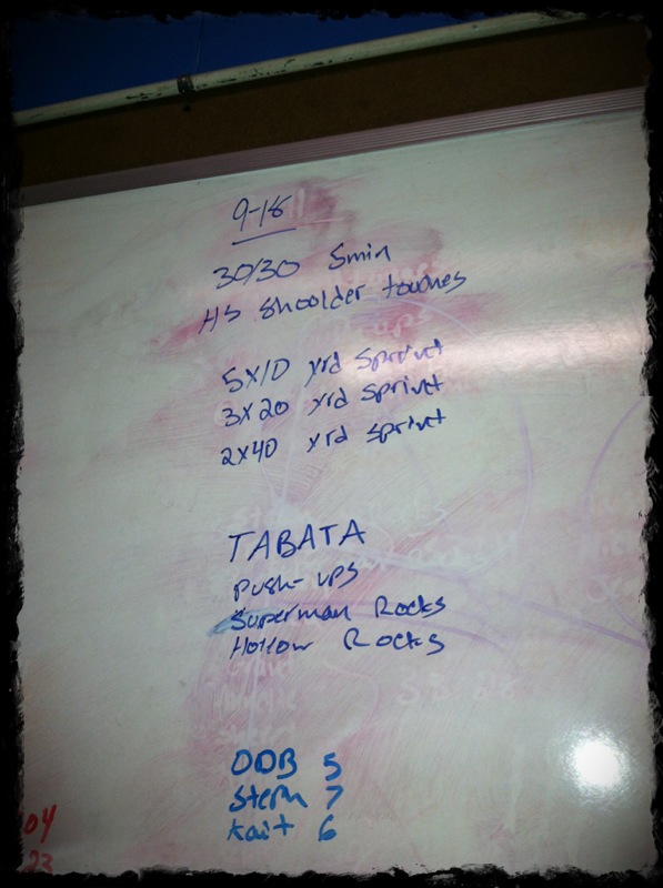 MetCon: 5 x 10yd sprint, 3 x 20yd sprint, 2 x 40yd sprint. Then TABATA of Pushups, Superman Rocks and Hollow Rocks. That wasn’t the original plan, TABATA but Coach gave us the change up. The T-WORD, TABATA! booooo! The Sprints were a nice change of pace, compared to the RUNS we call SPRINTS, hehehe, so yes *coughgrantcough* this was a much needed lighter day. Now back to TABATA. 20 seconds on 10 seconds off for 8 rounds. Your score is the lowest rep count that you get. We only counted Push Ups and woooo they hurt. So I started off what seemed strong with 13 but I dwindled fast. Kept my last rounds at 7 Push Ups so my score is 7. We didn’t count the Superman Rocks or Hollow Rocks and thank goodness because I lost count fast.