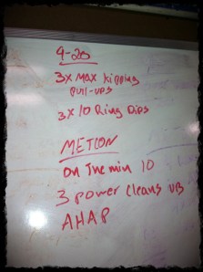 MetCon: 3 Power Cleans As Heavy As Possible on the minute for 10 minutes. I love CLEANS! And last night ESPN2 aired the CrossFit Games 2012 Men’s Clean Ladder. It was impressive to say the least and I feel that watching them gave me some confidence back with this lift. It wasn’t too long ago that I was struggling. Below is Neal Maddox killing it at 365lbs. Clearly this isn’t a Power Clean but it’s inspiring.