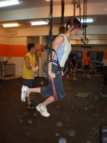 I no likey the Pull Ups and I can’t do them so Coach had me work on Negative Hangs. I am horrible at all things Pull Up related but I got some good hangs in and hopefully building that upper body strength. The cat in the picture above has better hangs than me though. We moved to the Ring Dips which I haven’t done in FOREVER but those are much better than Pull Ups. I did have to use a band because I’m not super beastly yet. Baby Steps!