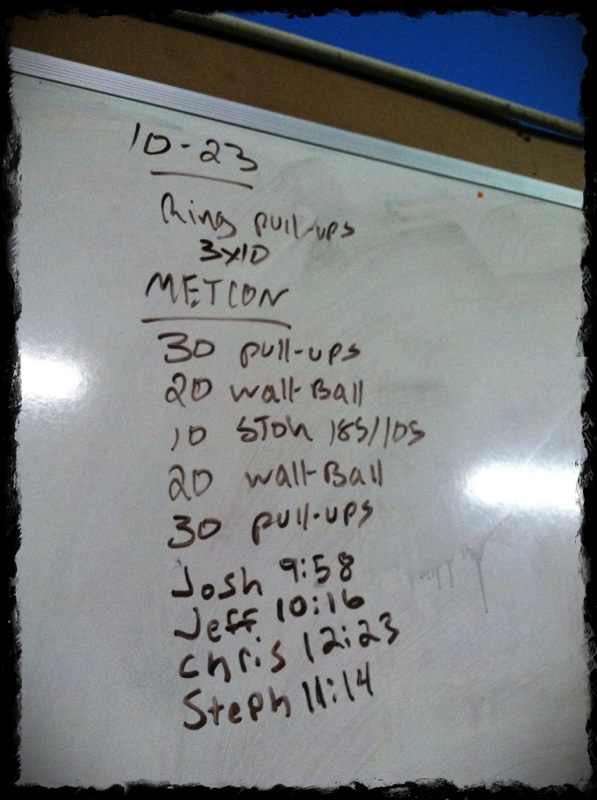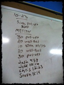I knocked out 10 Ring Rows, then 5, then 6 and then I don’t know what till I got to 30. I suck at Wall Balls and really dragged ass on those. Got to the STOH and pushed out 5 but lost momentum and dropped the bar. I sure as hell didn’t want to Clean it again but I did and decided I would SPLIT JERK the remaining 5 reps. Well I was doing great and did my 5th rep, dropped the bar and moved to Wall Balls. Coach NO REPPED me!!! ARGH. I didn’t step together and show I had control on the last rep! It was a mindless act, I didn’t do it on purpose But I had to Clean the bar again and do that last REP! ARGH! NOW onto Wall Balls, I threw that damn ball up there, hit the mark but was unable to catch it on the way down. I was done! I struggled through the 19 reps left! Hahah, I ended up knocking them out in sets of 5 but it was a sad sight. 30 Ring Rows left and I could only bust out a handful at a time. Time: 11:14. Those damn WALL BALLS, I let them get in my head and take up too much time. One day I will own Wall Balls!