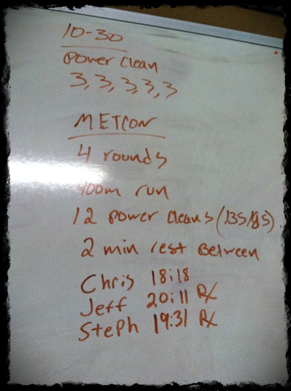 MetCon: 4 rounds of 400m run, 12 Power Cleans (85lbs), 2 minute rest